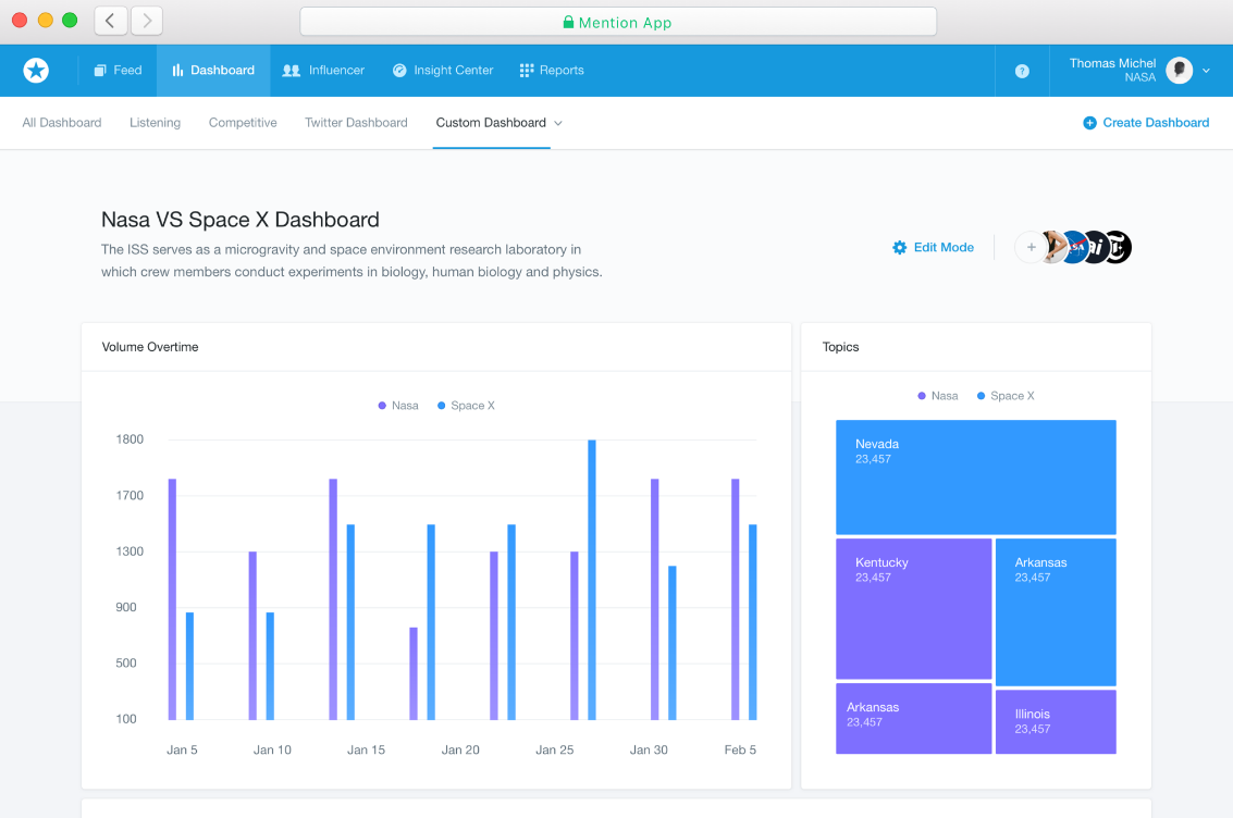 Es una herramienta de monitoreo de redes sociales que permite a las empresas supervisar su marca en línea y mantenerse al tanto de lo que se dice sobre ellos en tiempo real. La plataforma rastrea miles de fuentes de noticias, blogs, foros y redes sociales, lo que permite a los usuarios mantenerse al tanto de las conversaciones más importantes que involucran su marca. Mention también ofrece análisis de sentimientos y análisis de influencia, lo que ayuda a las empresas a identificar a los usuarios más influyentes y a interactuar con ellos de manera efectiva. Además, la plataforma ofrece una herramienta de colaboración que permite a los usuarios trabajar juntos en la gestión de su marca en línea.