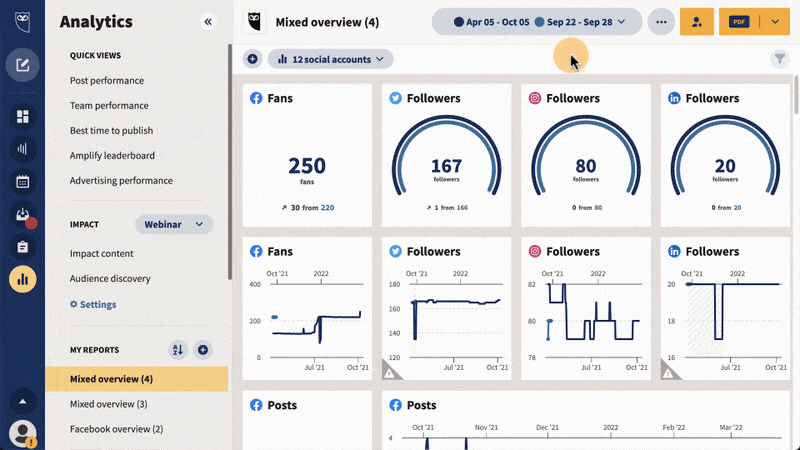 Es una herramienta de análisis de redes sociales que ayuda a las empresas a comprender cómo las personas interactúan con su marca en línea. La plataforma rastrea el tráfico web, las menciones en las redes sociales y las tendencias de búsqueda en tiempo real, lo que permite a los usuarios tomar decisiones más informadas sobre su estrategia de marketing. Hootsuite Insights también ofrece análisis de sentimientos, lo que ayuda a las empresas a medir la actitud de los clientes hacia su marca y a responder a los problemas de manera efectiva. La plataforma se integra con Hootsuite, una herramienta de gestión de redes sociales líder, lo que permite a los usuarios administrar sus perfiles de redes sociales y su análisis en un solo lugar.