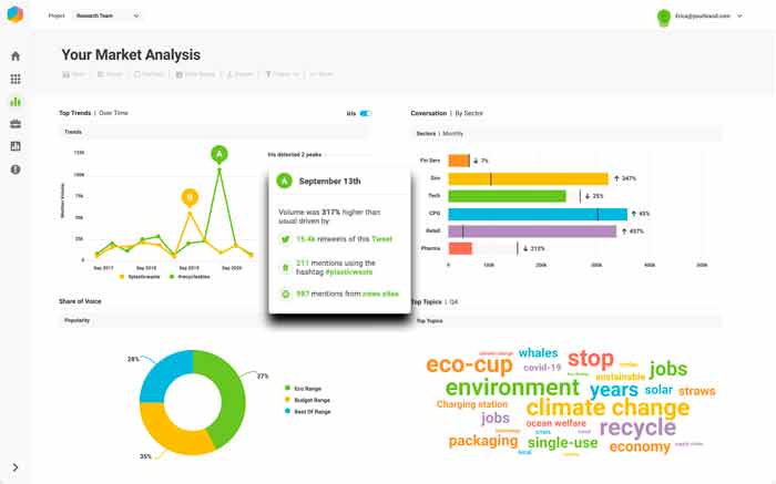 Es una plataforma de análisis de redes sociales que permite a las empresas monitorear y analizar la actividad en línea relacionada con su marca. Fue fundada en 2007 y cuenta con una interfaz fácil de usar que permite a los usuarios crear informes personalizados y análisis de datos en tiempo real. La plataforma también ofrece herramientas de seguimiento de tendencias y análisis de sentimiento para entender mejor cómo los usuarios están interactuando con la marca en línea. Además, Brandwatch cuenta con una función de monitoreo de la competencia que permite a los usuarios analizar la actividad en línea de sus competidores y compararla con la de su propia marca.